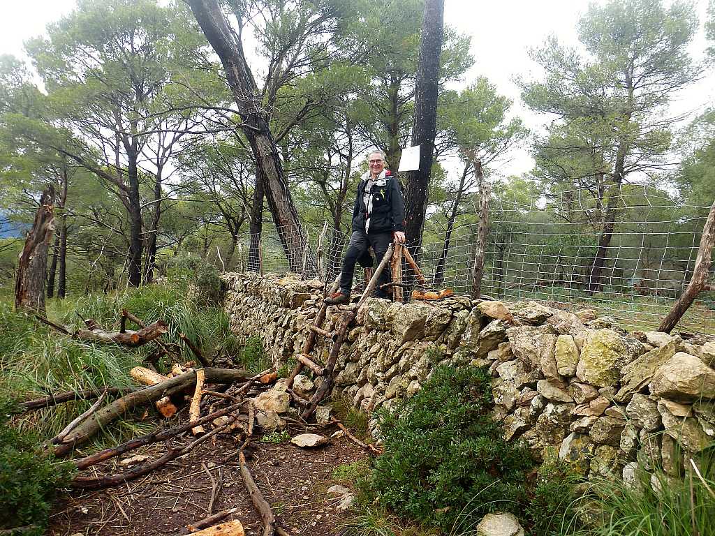 Al costat sud d’aquesta plana hi ha una paret amb un botador. Passam a l’altre costat i seguim un tirany, molt marcat, que ens mena a voltar aquest puig, ara per la cara sud. De començament, aquest tirany ens mena entre la garriga, entre pins caiguts i mates de carritxeres, i ens manté orientats a sud. Hi ha altres senderes marcades però pensam que totes acaben per ajuntar-se amb un camí de carro, més clar i definit, que trobarem només deu minuts després de botar la paret.