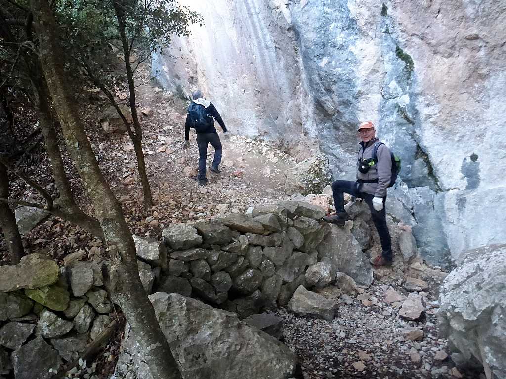 A les 8,50 h. arribam al començament del pas, ......sembla que en diuen el pas del Coll des Puig. Son les mateixes roques que ens permeten enfilar-nos, sense major dificultat, cap a la cresta. Si que és veritat que la vista cap el clot de Monnàber resulta impressionant, però aquesta darrera grimpada no és especialment arriscada. Aquest pas està coronat per una paret seca, quina finalitat seria marcar la partió entre les finques de Monnàber i Son Torrella, alhora que barrar el pas al bestiar que hi pasturava.