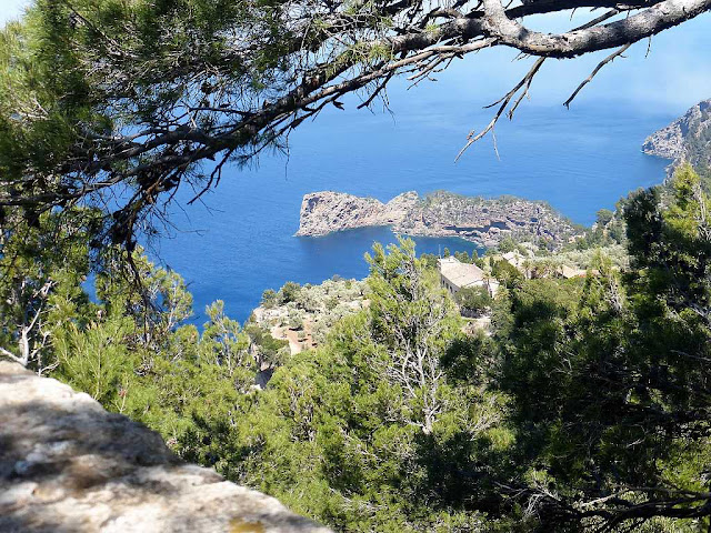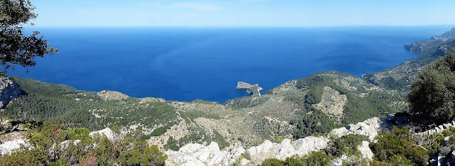 Son les 11,00 h en ajuntar-nos amb el GR-221, que puja per la coma des Cairats, ara el seguirem una estoneta, sempre pels punts més alts dels Cingles de Son Rul·lan. És aquest redol el punt més alt de la volta d’avui, ......i el vent hi bufa fort aquest matí. Uns deu minuts després, quan tenim a la vista el cim del puig Caragolí (945 m),......el camí abandona la cresta i comença a davallar, suaument entre el roquissar, per menar-nos cap a Deià. El caminet està folrat de pedreny menut, senyal clara del pas freqüent dels caminadors. Cercam un redol amb bones vistes i amb una mica de redós d’aquest vent que no afluixa i ens arriba amb tota la seva força. Tot just arribar al tall de les timbes, el lloc desitjat es fa palès. Gaudim d’una bona estona de repòs amb vistes espectaculars.