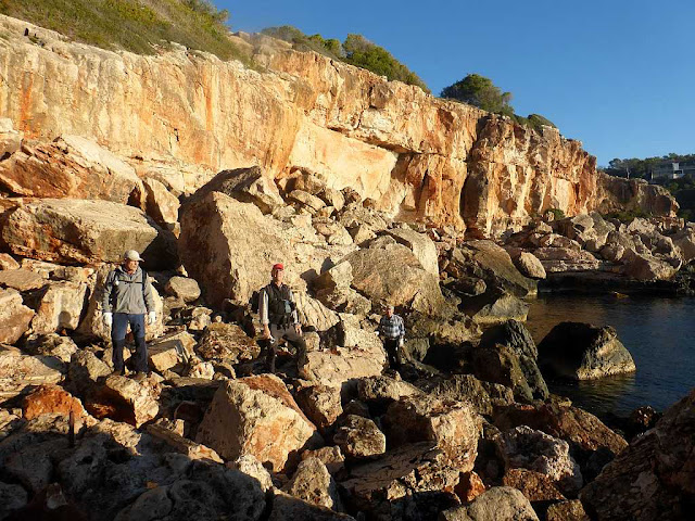 No podem seguir perdent el temps o no aconseguirem les fites del dia. Així que, deixam enrere la cala i anam avançant per damunt les roques de la vorera, ara orientats a sud. Tal com passa per aquesta zona, els estrats inferiors estan ben definits i resulten casi be plans del tot. La dificultat és que, de tant en tant, ens trobam amb zones on els penya-segats que hi ha damunt, s’han esbaldregat i les roques caigudes, algunes de considerable grandària, casi arribem a barrar-nos el pas. Tot això ho trobam un cop hem sortit de la cala. Anam a vorera de mar oberta i el sol ens dona de ple. Ben aviat ens llevam roba d’abric. El trànsit pels peus dels penya-segats no resulta excessivament complicat i ens permet no perdre detall del que ens envolta. Les tonalitats dels penya-segats que tenim damunt nostre van mudant així com avançam, de manera que passen del vermell a un rosa casi blanc. Tanmateix la sensació que no podrem anar gaire lluny ens envolta. Cada punta que superam comprovam ......que la zona accessible és més estreta ......fins que arribam al punt on queda clar no podrem seguir per baix de les penyes. Ni podem superar aquest punt ni podriem seguir avançant més enllà. Tot el que veiem son roques tallades a plom damunt la mar.