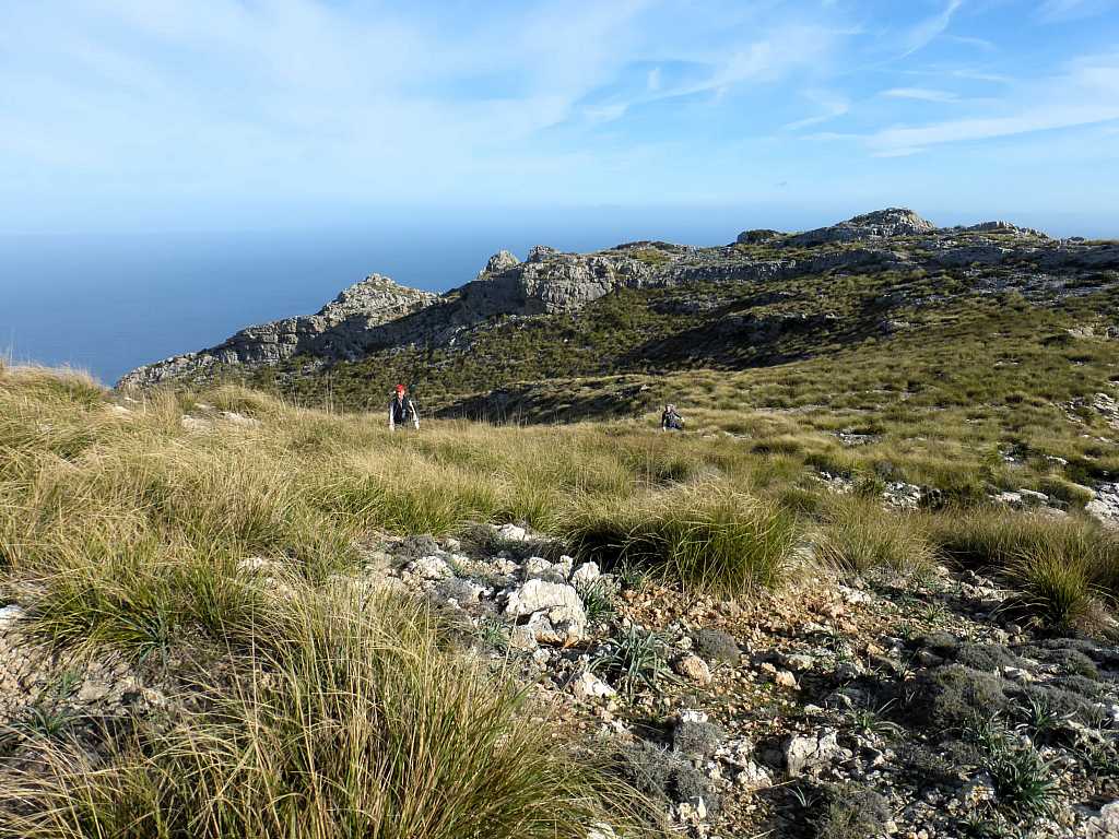 Son les 10,15 h. Hem arribat al coll i és el moment d’abandonar el camí. Al costat nord hi tenim el cim del puig de ses Moles, la següent fita d’avui. Des d’aquí no sembla accessible. Començam pujant per les seves faldes, cobertes de carritxeres no gaire espesses que ens ajuden a anar superant la forta pendent que tenim davant. De mica en mica anam desviant-nos cap a la cara nord del cim ja que els espadats ens barren el pas. Ben aviat el territori perd la verticalitat i es fa accessible per poder arribar a la cresta i seguir fins el cim. Hi arriban a les 10,30 h (731 m). Aquí hi bufa un vent gelat i prou violent. No hi fa gens bon estar. A pesar que el dia és clar el sol no ens arriba a encalentir. Decidim seguir la caminada. Vorejam les timbes, caminant cap a nord, per tal d’anar superant els successius cims d’aquesta petita serralada. El territori és prou accessible i no ens calen gaires grimpades. Passam per les cotes 726 i 733 (aquesta marcada amb una gran fita) i acabam per aturar-nos a una mica de redós que trobam a la cota 732. És l’extrem nord de la serra, conegut com es Més Alt de Lavanor. Segueix fent fred i bufant el vent gelat, però gaudim de bones vistes des del Morro de sa Vaca, a sa Calobra, fins el Musclo de ses Cordes, al Rafal d’Ariant. Fins i tot veiem algun camp de conreu de la clotada d’Ariant.